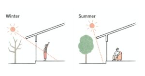 - 冬は日射熱利用:低い位置にある冬の太陽光をお部屋の奥まで取り込み、自然の暖房として活用します。